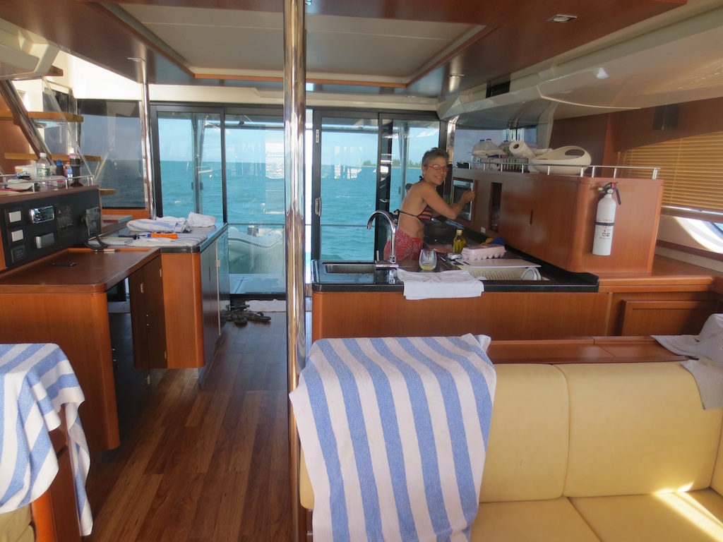 Rachel preps an Anegada breakfast in the powercat's galley, which is the same size as her kitchen at home.