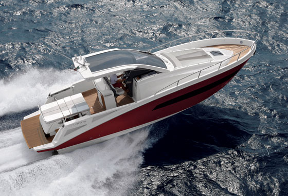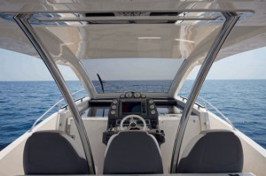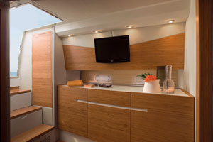 Although the Italians call the Verve a day cruiser, the cabin accommodations are just right for weekends. There’s a private stateroom with king-size berth, a head, a convertible dinette, and a console that can be used as a mini-galley or wine cellar. Air conditioning is offered, too, so you can admire the pretty interior (bamboo cabinets and light fabrics) in cool comfort.