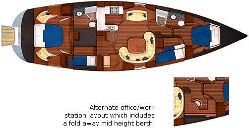 This is a very nice accommodation plan. The galley looks good with counter space on each side of the range for pots and pans. The sinks could be moved aft a foot. The big, curved dinette looks roomy, but I don't think you could seat more than four in comfort. Note the wet locker location and the handy sea berth in the passageway aft. I think the foot of the sea berth tucks into the aft cabin. Sleeping areas are roomy and have plenty of hanging locker space. The small stateroom forward has upper and lower berths and a small vanity. It's tight, but adequate. There is access from the forward stateroom to the head and shower.