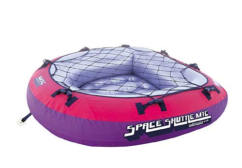 Filled with four riders or stuffed with gear, the Space Shuttle is simply huge. It measures 80 inches by 80 inches — get this — deflated. And it's ultra tough. The tube itself is 30-gauge vinyl with an inflatable cushioned floor. Covering the tube is 840 Denier double-coated nylon with a rear mesh drain vent and a double-reinforced towing harness. A heavy-duty Kwik-Connect makes for easy hook-ups.