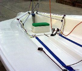 Our testing and beach launching in the surf at Daytona Beach proved to be very successful and the oversized cockpit drain tubes very effective. We elected to retain a full transom as an integral part of the hull and deck design to offer greater structural integrity and security for the crew. The free standing rig was designed to be user friendly and has a powerful sailplan. Rigging on the beach, on the water, or on a trailer is easy even for a small person.