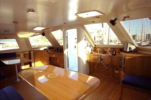 There is nothing like the feeling of driving a large fast catamaran from the midships cockpit of the Atlantic cat design. With complete visibility and all sail controls near at hand, an Atlantic cat fits like a glove. But after a few hours of sailing, in any kind of boat, the time comes to get out of the wind and sun or worse yet, wind, dark and wet. Enter the pilothouse- this is where the Atlantic Catamaran configuration has no equal. Offering an inside steering and navigation station with an unobstructed view of the horizon all around the Atlantic cats are the epitome of sailing comfort. Standing watch warm and dry in all weather conditions is an addictive experience that had me hooked on my first night offshore (a stormy one) on the original Atlantic 50 cat in 1985.