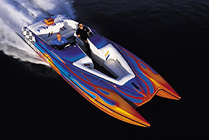 Introduced in 1998, the 2800 Cat rides on a modified tunnel hull with a notched center pod and inline strakes on its two sponsons. Commander outfitted the boat with the previously noted, 509-cubic-inch blown motor and a TCM Platinum XR drive with a 1.5:1 gear reduction. It's worth noting that the TCM engine-and-drive combo was responsible for $47,000 of the catamaran's $120,900 asking price.